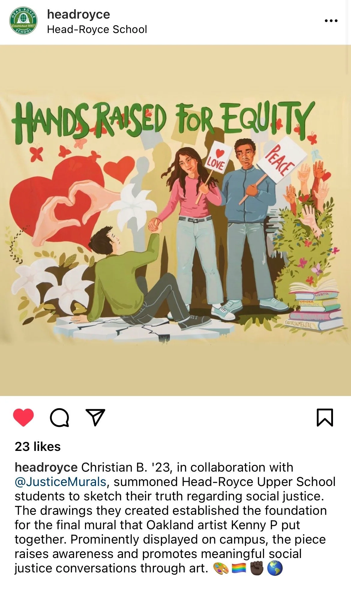 Good Morning Campolindo! On this final day of the school year, I wish to share with you an inspiring project by one of our very own students, Carolyn Considine. Campolindo students were asked to submit drawings and words about what social justice means to them. The muralist, Jaz Alexander (as an aside, he is Steph Curry's brother-in-law), took these drawings and helped incorporate them into a mural. Other high schools in the county will be participating in this social justice project in the fall, and these murals will travel from school to school to highlight what social justice means from our student's perspective across the county and beyond. Campolindo is the first high school to pilot this Justice Wall program, and the high school students of the county voices will shine through. As a school community, we have come together to create change. The road is long, and the journey is ongoing, but together, we can accomplish greatness.